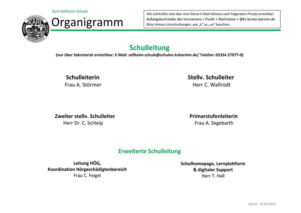 Im folgenden Organigramm finden Sie die Ansprechpartner der Karl-Sellheim-Schule mit eMail-Adressen.
