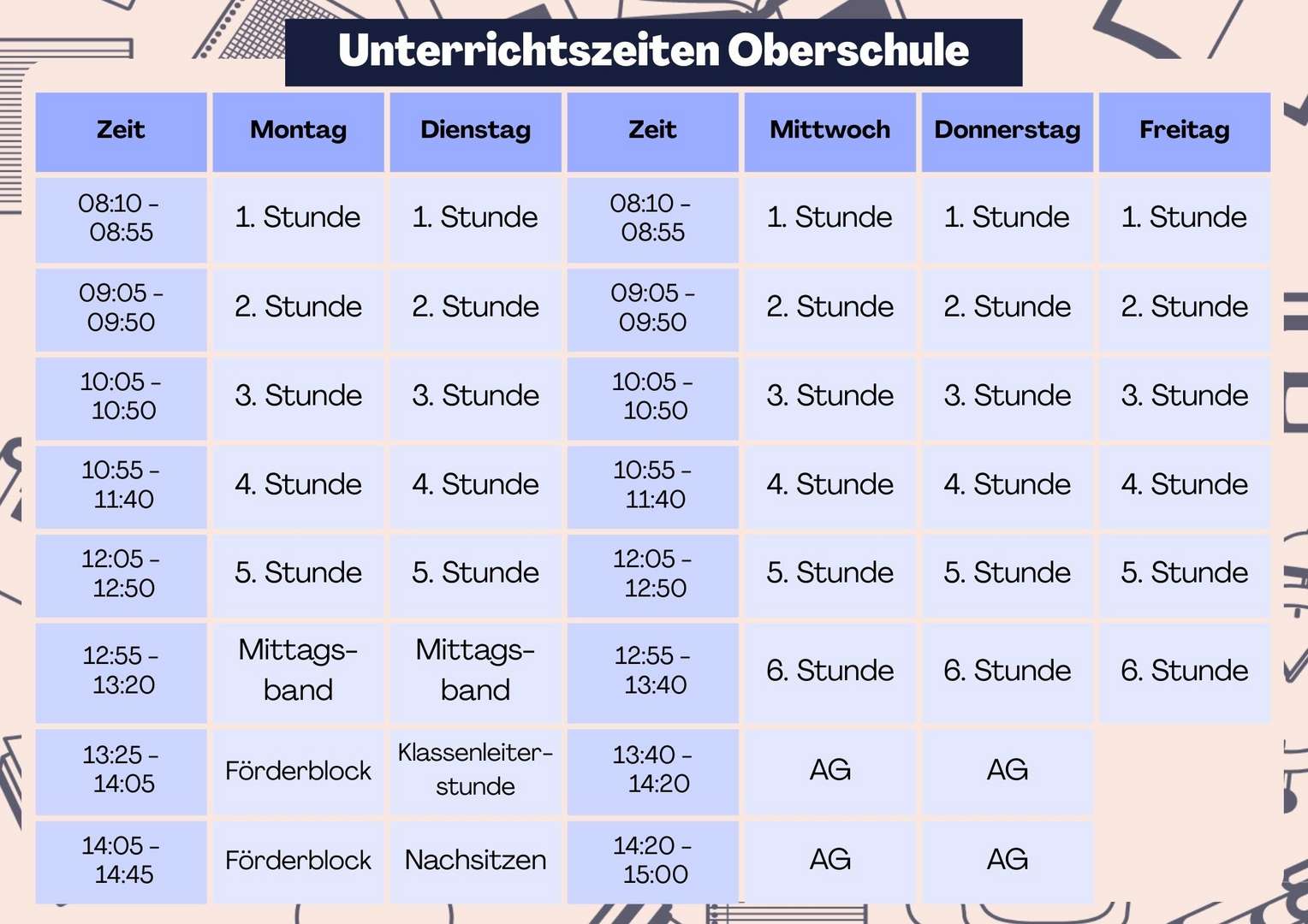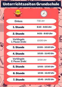 Hier finden Sie eine Übersicht der Unterrichtszeiten der GS und OS. Sollte hitzefrei geben, werden die Unterrichtsstunden nicht gekürzt sondern es findet ein früheres Unterrichtsende (nach der 4. oder 5. Stunde) statt.